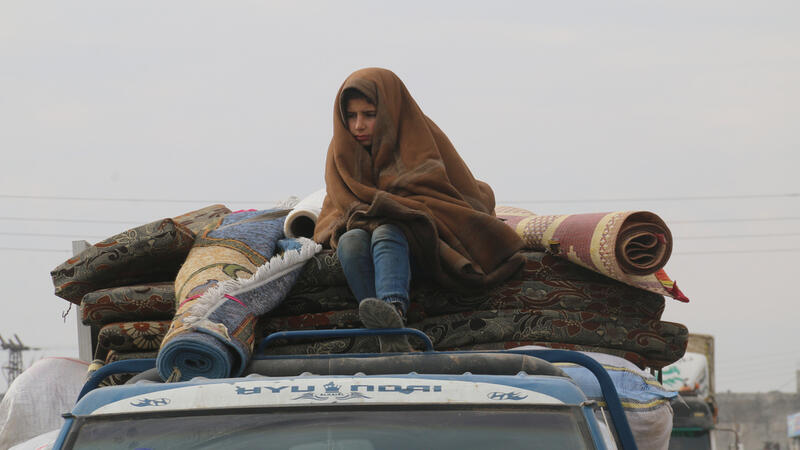 A Syrian refugee child in a rainy weather, a child sits on the roof of a car while fleeing the bombing of Idlib. Aleppo. (Shutterstock/ File Photo)