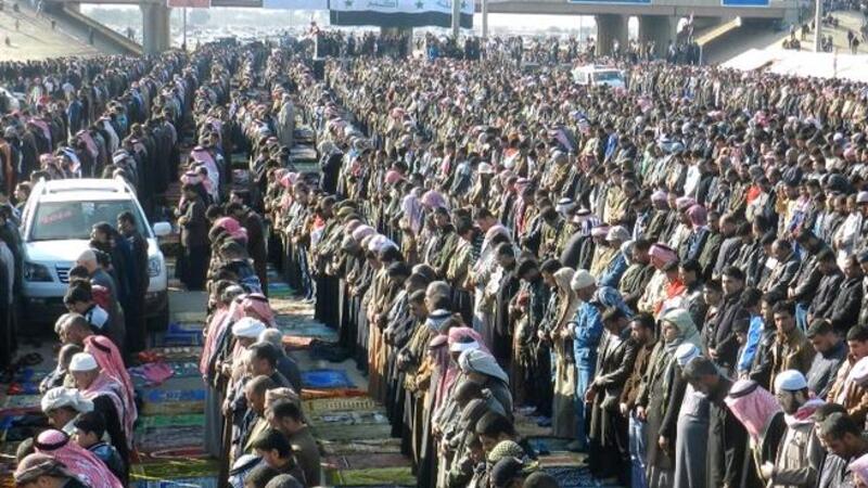 Iraqi Sunni protestors pray on the main highway to Syria and Jordan near Ramadi. (AFP PHOTO / AZHER SHALLAL)