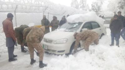 In this handout photograph released by Pakistan's Inter Services Public Relations on Saturday shows soldiers taking part in a rescue operation to clear a road covered with snow in Murree (AFP photo)