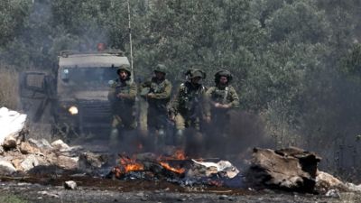 Israeli soldiers take position as Palestinian protesters clash with Israeli forces during a weekly demonstration against the expropriation of Palestinian land by Israel in the village of Kfar Qaddum, near Nablus in the occupied West Bank, on May 11, 2018. (JAAFAR ASHTIYEH / AFP)