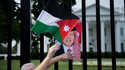 A supporter of Jordan's King Abdullah II is seen on Pennsylvania Avenue outside the White House before the leader's visit with US President Joe Biden on July 19, 2021, in Washington, DC. Brendan Smialowski / AFP