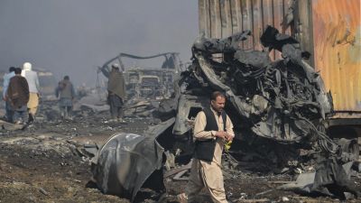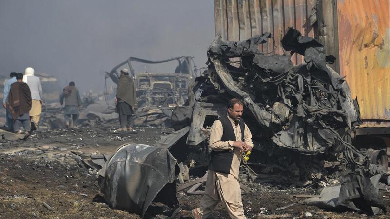 Afghan men walks past the wreckage of gas tankers after a fire accident at Islam Qala on the outskirts of Herat, in the border between Afghanistan and Iran on February 14, 2021. HOSHANG HASHIMI / AFP