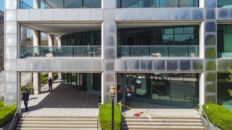 Picture shows the area where a shooting took place in downtown Louisville, Kentucky, on April 10, 2023 leaving five dead, including the gunman, and eight hospitalized, according to police. A Louisville police spokesman told a media briefing that a police officer was among the injured, while the department tweeted separately that the "suspected shooter has been neutralized." "There is no active danger to the public at this time," the spokesman told reporters. (Photo by LEANDRO LOZADA / AFP)
