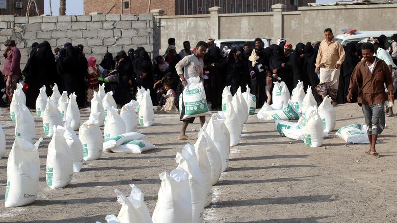 Workers prepare food aid and provisions to meet basic needs, to be distributed to Yemenis displaced by conflict, at a camp in the Khokha district of Yemen's war-ravaged western province of Hodeida, on March 1, 2022. (Photo by Khaled Ziad / AFP)