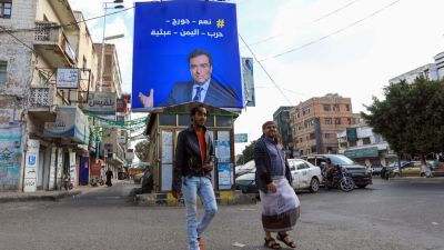 A portrait of Lebanese Information Minister George Kordahi is displayed on a billboard in the Yemeni capital Sanaa on October 31, 2021 [MOHAMMED HUWAIS/AFP via Getty Images]