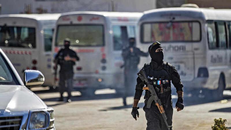 Members of Kurdish security forces deploy around buses carrying women and children from families of Islamic State fighters, after they were handed over to Tajikistan, in Syria's Kurdish-majority city of Qamishli in the northeastern Hasakeh province, on July 25, 2022. Authorities of the semi-autonomous Kurdish administration in Syria's northeast handed over 42 women and 104 children from families of Islamic State (IS) fighters to Tajikistan, the first such initiative with the Tajik government, a Kurdish official said. (Photo by Delil SOULEIMAN / AFP)