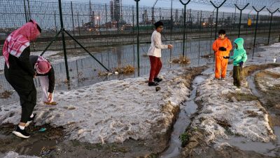 Youths inspect hail particles along the side of a road after a storm in the Umm al-Haiman district, about 55 kilometres south of Kuwait City, on December 27, 2022. (Photo by YASSER AL-ZAYYAT / AFP)