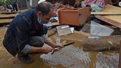 A man tries to salvage items from a flooded street in the Algerian capital Algiers on September 8, 2020. / AFP / RYAD KRAMDI