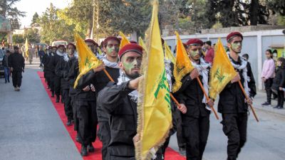 Fighters of the Lebanese Shiite movement Hezbollah march during a military parade commemorating their "Martyr's Day" parade, in the city of Baalbek in Lebanon's eastern Bekaa valley, on November 13, 2021. (Photo by AFP)