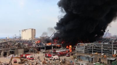 Lebanese firefighters put out a fire that broke out at Beirut's port area, on September 10, 2020. Sweeping forest fires, a monster explosion that killed friends, then bizarre Beirut blazes: Lebanon's rescuers are still reeling from a devastating year, but are determined to press on. ANWAR AMRO / AFP