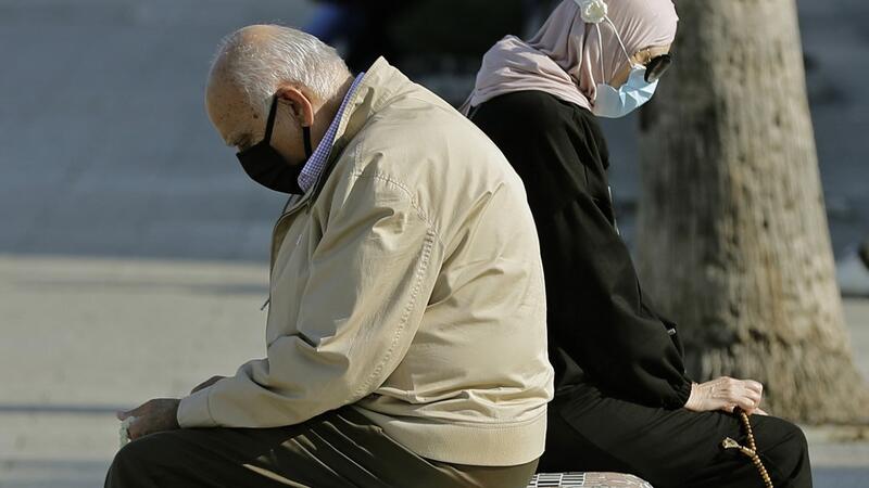 A man and a woman sit back to back on a bench as they enjoy a sunny day near the Beirut seaside promenade on November 24, 2020. JOSEPH EID / AFP