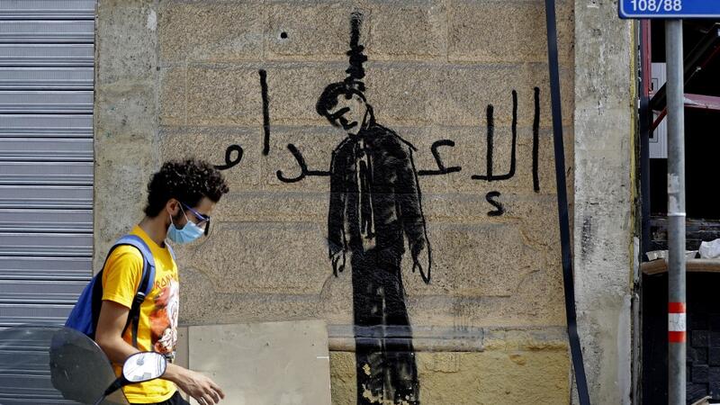 A Lebanese volunteer walks past graffiti depicting a hanged politician with the word "execution", in the devastated Beirut neighbourhood of Gemmayzeh, on August 11, 2020, following a huge chemical explosion that ravaged large parts of the capital. JOSEPH EID / AFP