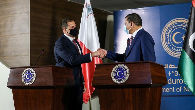 Libya's interim prime minister Abdul Hamid Dbeibah and Malta's visiting Prime Minister Robert Abela shake hands during a joint press conference at the prime minister's office in the capital Tripoli on April 5, 2021. Mahmud Turkia / AFP