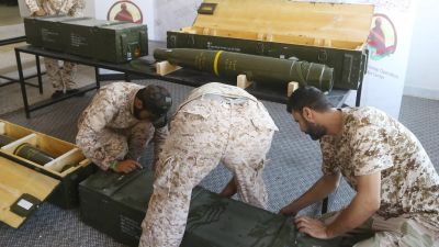 Libyan Government of National Accord (GNA) displaying Chinese-made shells bearing the markings of the United Arab Emirates (left side on the box), which were reportedly seized from forces loyal to General Khalifa Haftar in Gharyan. (AFP/ File Photo)