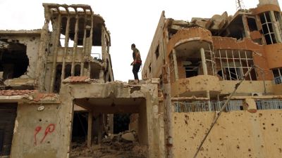 A Libyan man stands atop a destroyed building on February 29, 2016 in Benghazi after the area was retaken by Libya's internationally recognized government. (AFP/Abdullah Doma)
