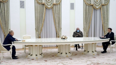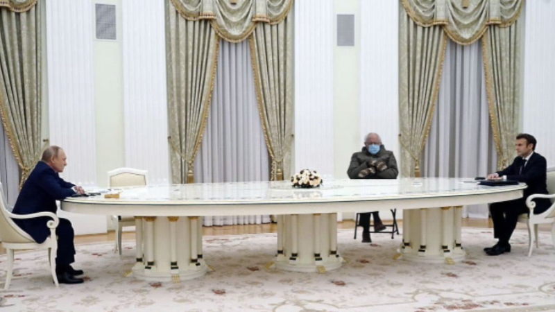 An image of talks between Russian President Vladimir Putin's and his French counterpart Emmanuel Macron over the Ukraine crisis has been widely mocked on social media.
