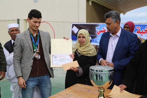 April 2020, Sabratha (Libya). Ms Hamida Abu Algasim Ewshah, member of Sabratha Municipal Council, gives a prize to the champion of a local tennis tournament at Sabratha Tennis Academy. Photo: ©UNDP Libya/Abdullah Hussin.