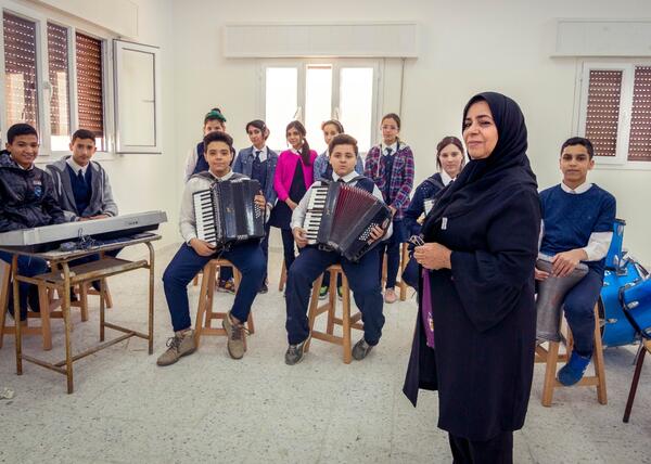 July 2019, Tripoli (Libya). Ms Zahra Al Tabal is showing students how to lead an orchestra at Al Ribat School in Tripoli. Photo: © UNDP Libya/ Malek Elmaghrebi