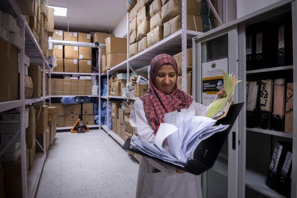 April 2020, Tripoli (Libya). Dr. Asma Ali Elghoudi, Head of the Medical Supplies and Equipment Department at Jalaa Maternity Hospital, stores medical equipment. Photo: ©UNDP Libya/Malek Elmaghrebi