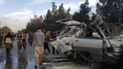 Residents gather next to a damaged minibus after a bomb blast where two people were killed and five wounded in Kabul on November 17, 2021. (Photo by AFP)