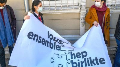 Two women hold a banner reading “All together” as Galatasaray University’s French teachers without working permits give a press conference in front of Galatasaray university in Istanbul on February 23, 2021. (AFP)