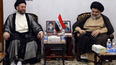 Iraqi Shiite Muslim leader and head of Hikma party Ammar al-Hakim (L) and Shiite cleric Moqtada Sadr meet in the Iraqi holy city of Najaf on May 17, 2018. Iran and its allies were mustering a bid to limit the role of fiery Shiite cleric Moqtada Sadr in Iraq's next government after his shock election win reshaped the country's political landscape. (Haidar HAMDANI / AFP)