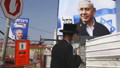 An Ultra-Orthodox Jew walks past roadworks as above hang election campaign posters of Israel's Yisrael Beiteinu party bearing a portrait of its leader Avigdor Liberman (L) and the Likud party showing its leader and incumbent Prime Minister Benjamin Netanyahu (R) on a construction site in the Israeli central city of Bnei Brak, on March 14, 2021. On March 23, the Netanyahu faces his fourth re-election contest in less than two years, after repeatedly failing to unite a coalition behind him, despite his devoted right-wing base. JACK GUEZ / AFP