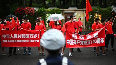 A smaller group of pro-Beijing activists hold a counter-protest during a march by pro-democracy activists against the 100th anniversary of the founding of the Communist Party of China, in Tokyo's Shinjuku district on July 1, 2021. Philip FONG / AFP