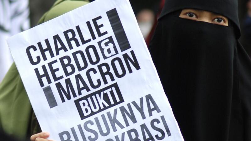 A Muslim demonstrator holds a placard during a protest against French President Emmanuel Macron for his comments over the Prophet Mohammed caricatures, in Bandung on October 30, 2020. Timur Matahari / AFP