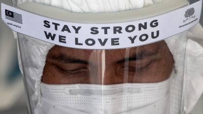 A health worker wearing a protective suit prepares to enter two apartment buildings in Kuala Lumpur on April 8, 2020, after they were cordoned off due to a number of cases of individuals with COVID-19 novel coronavirus at the premises. Mohd RASFAN / AFP