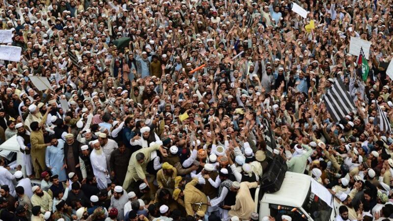 Supporters of Pakistan's religious hardline party Jamiat Ulema Islam (JUI) march during a protest rally following the Supreme Court's decision to acquit Pakistani Christian woman Asia Bibi of blasphemy. ()