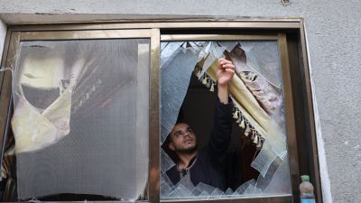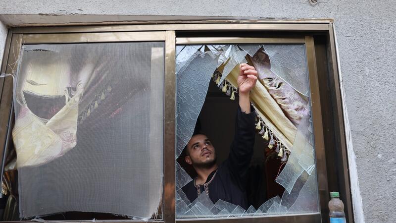 A Palestinian man removes glass shards from a broken window at his home which was damaged during the latest three days of conflict with Israel ahead of a truce, in Rafah town in the southern Gaza Strip, on August 8, 2022. (Photo by SAID KHATIB / AFP)