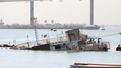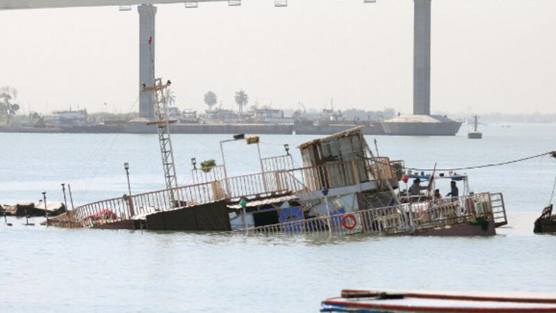 A picture taken in the southeastern Iraqi city of Basra shows a small casino boat that sank in the Shatt al-Arab river after a small device exploded nearby during the night.