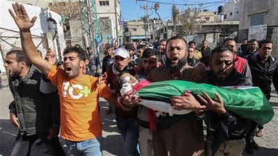 Mourners carry the body of a four-year-old Palestinian boy, who died of Israeli-inflicted wounds, during his funeral in Khan Yunis, Gaza Strip. (AFP)