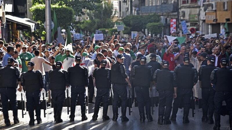 Algerian protesters face riot police during a demonstration against the ruling class in the capital Algiers on October 4, 2019, for the 33rd consecutive Friday since the movement began. (RYAD KRAMDI / AFP)