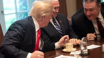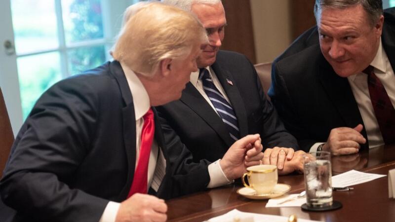 US President Donald Trump speaks (R) with Secretary of State Mike Pompeo as Vice President Mike Pence (C) (AFP/File Photo)