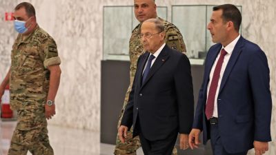 Lebanese President Michel Aoun (C) arrives for the first cabinet meeting at the presidential palace in Baabda, east of the capital Beirut, on September 13, 2021. Lebanon's newly-formed government held its first meeting to discuss ways of rescuing the country from one of its worst ever economic crises. (Photo by Anwar AMRO / AFP)