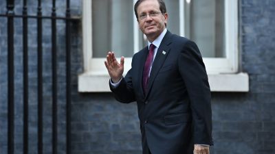 Israeli President Isaac Herzog waves as he arrives to Number 10 Downing Street in central London on November 23, 2021. (Photo by JUSTIN TALLIS / AFP)