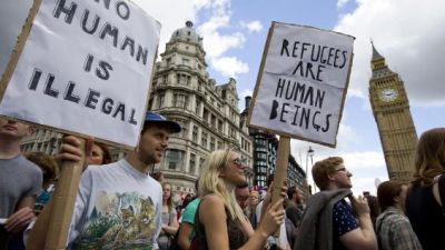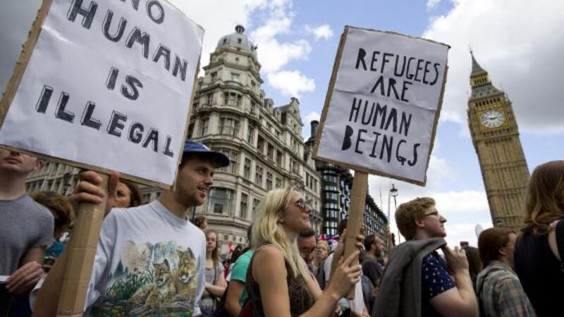 In London, about 4,000 people took to the streets, holding placards saying "Refugees welcome here" and "Stand up to racism".