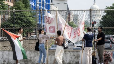 Activists with The Palestinian Youth Movement and the Party for Socialism and Liberation display a banner over North Capitol Street near the US Capitol in Washington, DC, on July 19, 2023.(Photo by ANDREW CABALLERO-REYNOLDS / AFP)