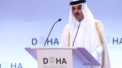 Emir of Qatar Sheikh Tamim bin Hamad al-Thani delivers a speech during the opening session of the Doha Forum in the Qatari capital on December 14, 2019. / AFP / MUSTAFA ABUMUNES
