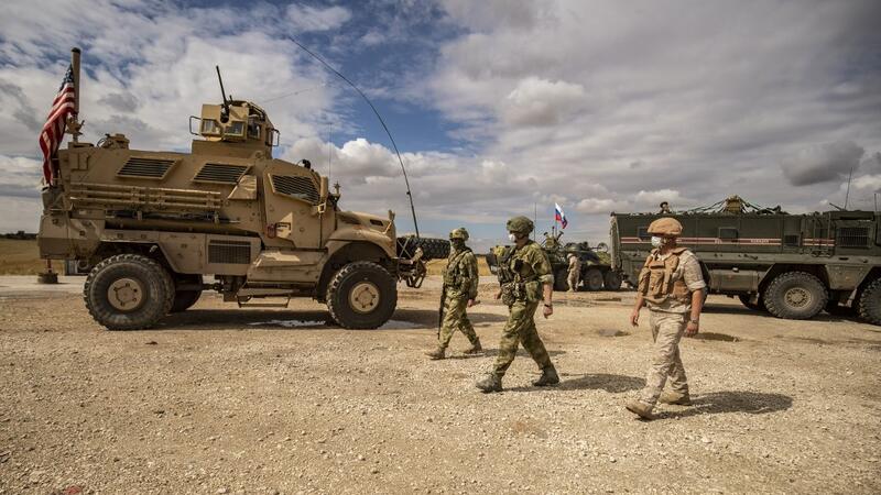Russian soldiers walk past an US military vehicle along the M4 highway by the town of Tal Tamr on May 25, 2020, as they monitor the reopening of the road to civilian traffic between the border towns of Kobane and Tal Tamr for the first time since a Turkish-backed invasion last year saw the route closed. DELIL SOULEIMAN / AFP