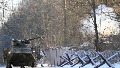 Servicemen, next to an armoured vehicle, take part in a joint tactical and special exercises of the Ukrainian Ministry of Internal Affairs, the Ukrainian National Guard and Ministry Emergency in a ghost city of Pripyat, near Chernobyl Nuclear Power Plant on February 4, 2022. (Photo by Sergei Supinsky / AFP)
