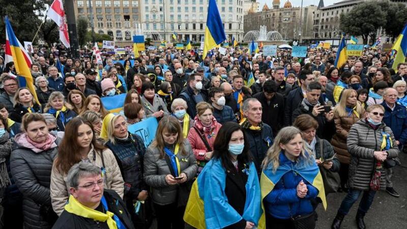 Protestors waving Ukrainian flags gather during a demonstration in support of Ukraine and to protest against Russia's invasion of the country, on the Plaza Catalunya square in Barcelona, on March 6, 2022. (Photo by LLUIS GENE / AFP)