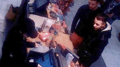 This file video image taken from a CCTV camera at a petrol station north of Paris on November 11, 2015 shows Salah Abdeslam (R), a suspect in the Paris attacks, and Mohamed Abrini (C) buying goods. (AFP/File)