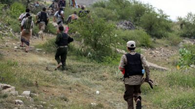 Fighters loyal to Abd Rabbuh Mansur Hadi march toward a hilltop position in Taiz on August 18, 2016. (AFP/Ahmad Al-Basha)