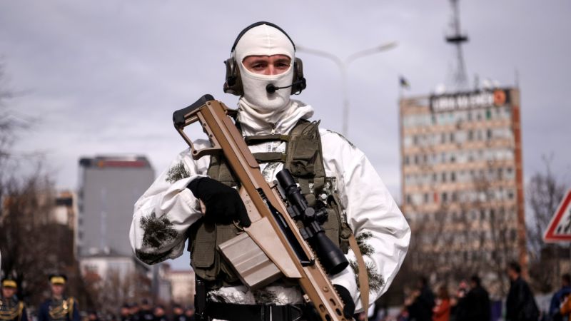 A member of the Kosovo police special intervention team parades during a ceremony to mark the 14th anniversary of Kosovo's declaration of independence in Pristina on February 17, 2022. (Photo by Armend NIMANI / AFP)