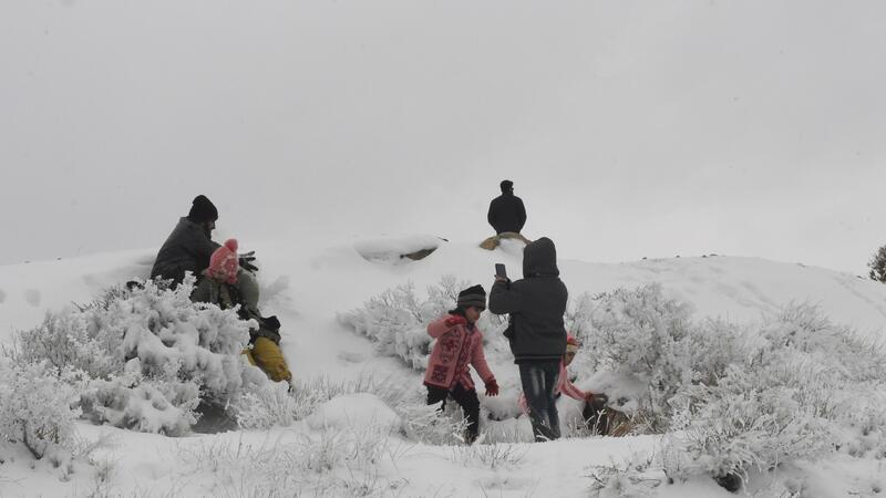Local tourists vist the snow covered area in Ziarat, around 70 Kilometres from Quetta in Balochistan province on January 8, 2022. (Photo by Banaras KHAN / AFP)