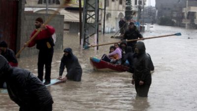 Palestinian civil defense volunteers help people to travel across flood waters in Gaza City following rain storms for the past few days, on December 14, 2013. [Getty Images]