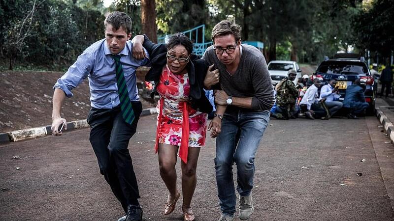 A woman is evacuated from the the hotel by two men during the terror attack on Tuesday afternoon which saw 21 civilians killed by the group of men linked to Al-Shabaab (AFP)